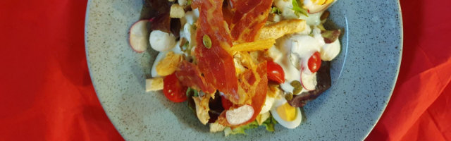 salata, pileće meso, cherry rajčica, baby mozzarella, panceta, jaje, grčki jogurt sjemenke bundeve